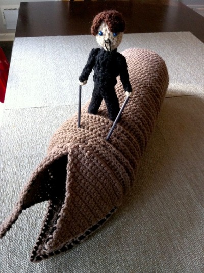 So, for now, please enjoy this image of a crocheted Muad’Dib riding a crocheted sandworm, courtesy of my wonderful employer Tor.com. You can find more of these great images here.